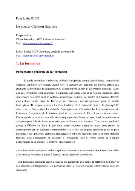 Master en Écriture créative à distance. 1 MASTER Création littéraire Parcours. Il connaît donc une diffusion très large au sein de lespace francophone et dépasse le cadre des frontières nationales.