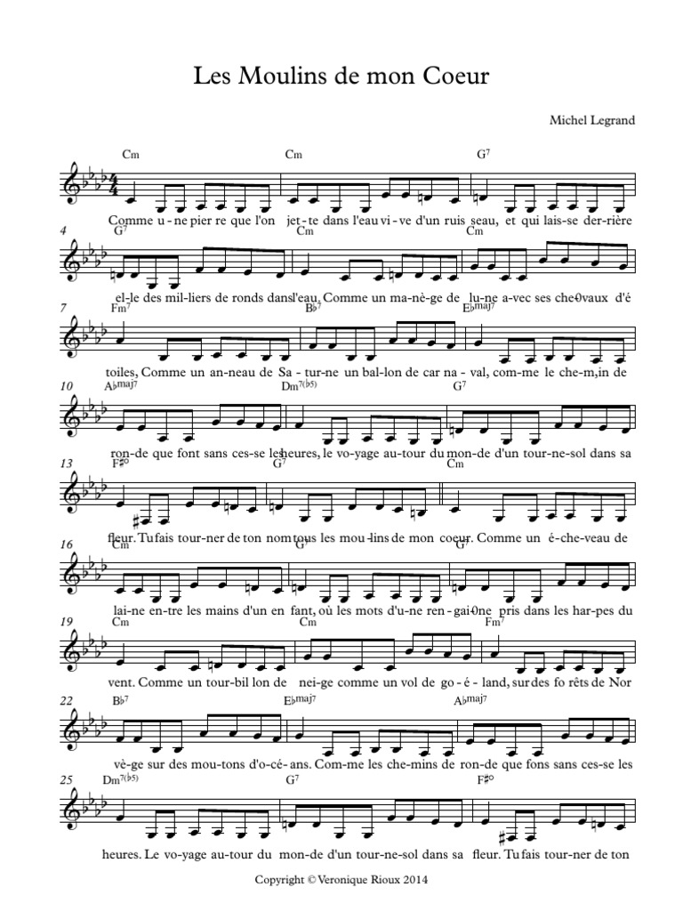 Téléchargez la partition Clarinette Les Moulins de mon cœur niveau très facile de Legrand. Please rate this score. Verse 1 Am Dm6 Comme une pierre que lon jette dans leau vive dun ruisseau E7sus4 E7 Am7 Et qui laisse derrière elle des milliers de ronds dans leau Em7 A7 Dm7 Comme un manège de lune avec ses chevaux détoiles Gsus4 G7 Cmaj7 Comme un anneau de Saturne un ballon de carnaval Fmaj7 Dm6 Comme le chemin de ronde que font sans cesse les heures Esus4 E7 Ddim7 Le voyage autour du monde dun.