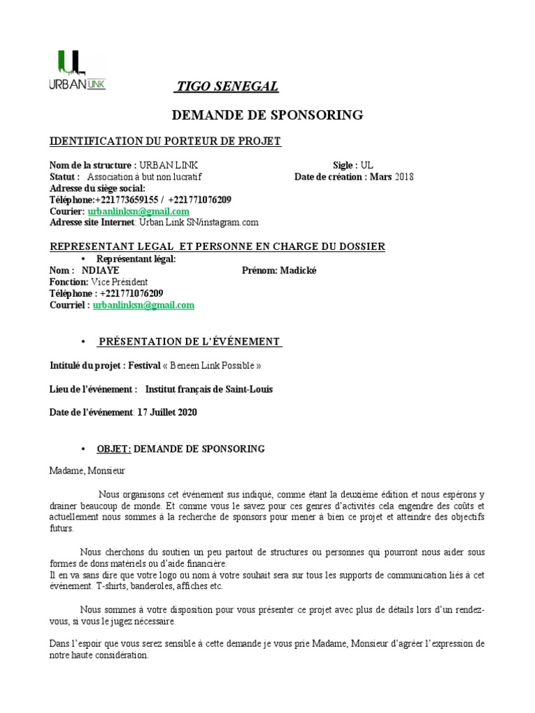 Tigo Senegal Demande De Sponsoring Identification Du Porteur De Projet