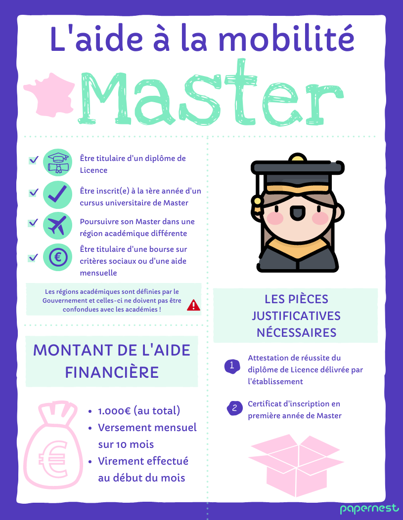 être titulaire dune licence 3. Le montant de laide à la mobilité Master est de 1000. Le ministère de lEnseignement supérieur de la Recherche et de lInnovation renouvelle la mise en place dune aide sous certaines conditions pour faciliter la mobilité géographique des étudiants boursiers titulaires dune licence inscrits en première année de master dans une région académique différente de celle dans laquelle la licence a été obtenue.